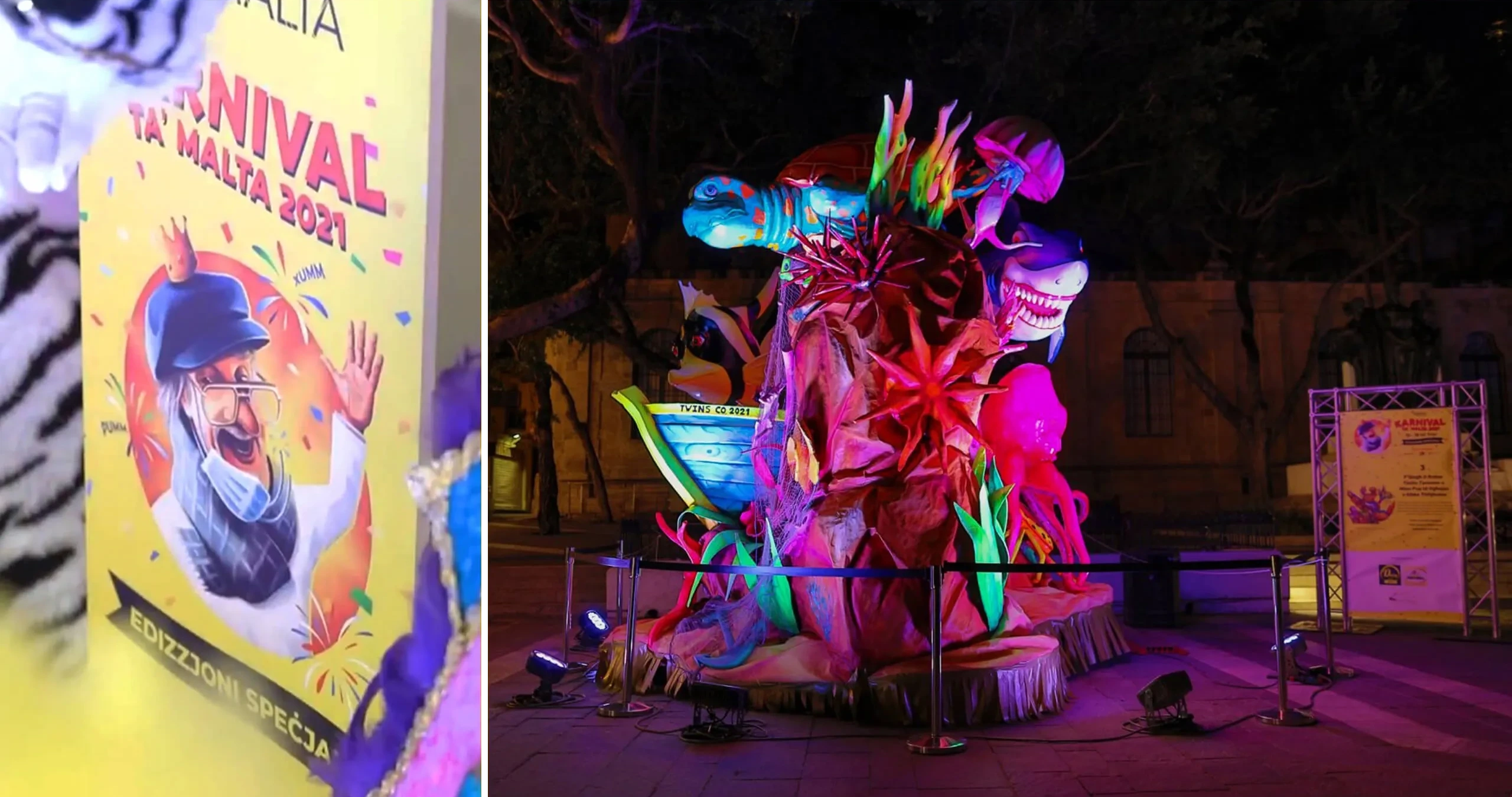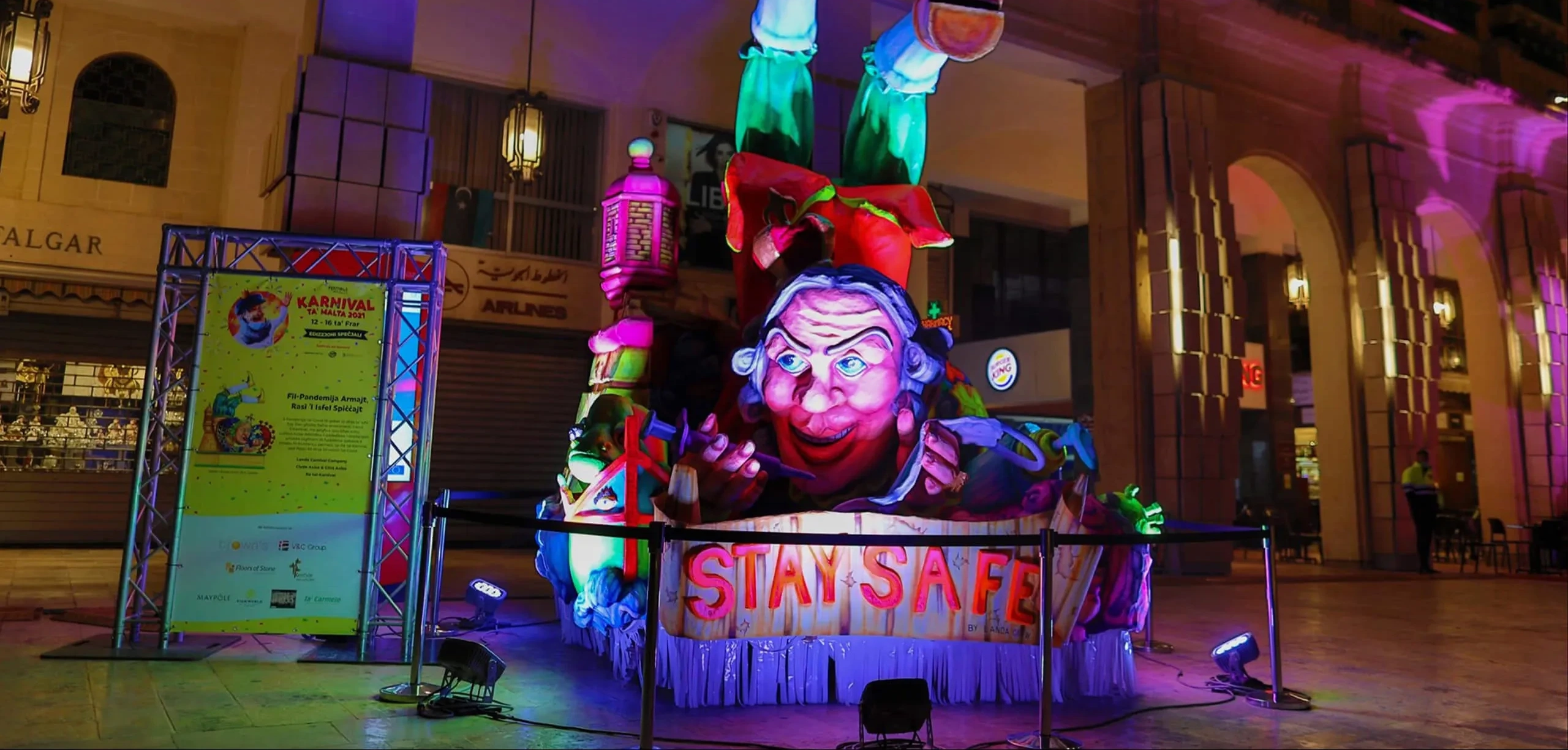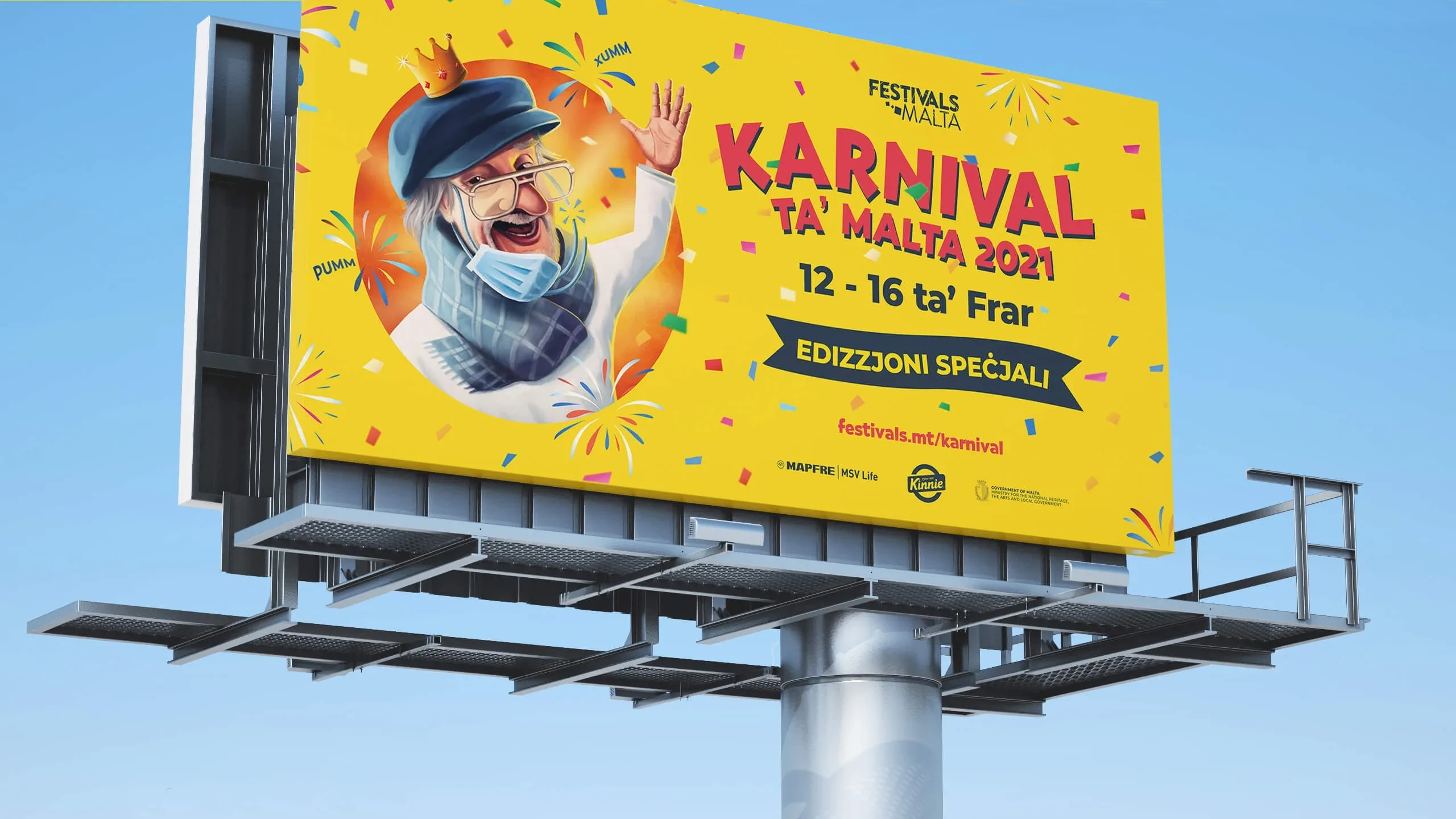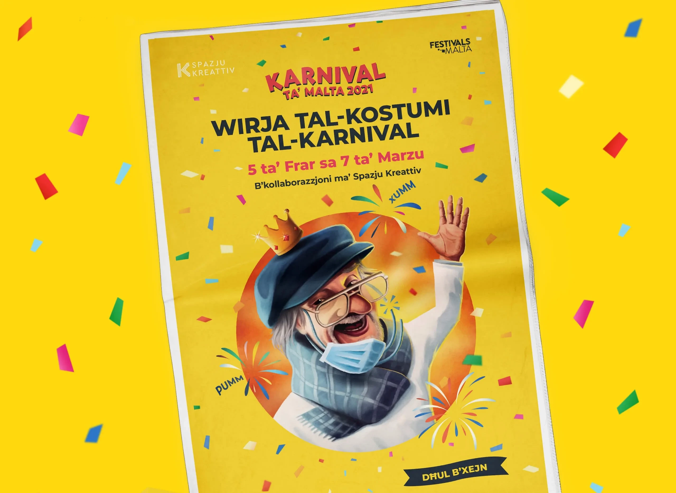 The creative concept behind the key visual combined some of the icons closest to the Maltese public’s heart. The late Pawlu Curmi, known as ‘il-Pampalun’, was chosen as the main protagonist, also representing the King Carnival icon in a fireworks setting.
